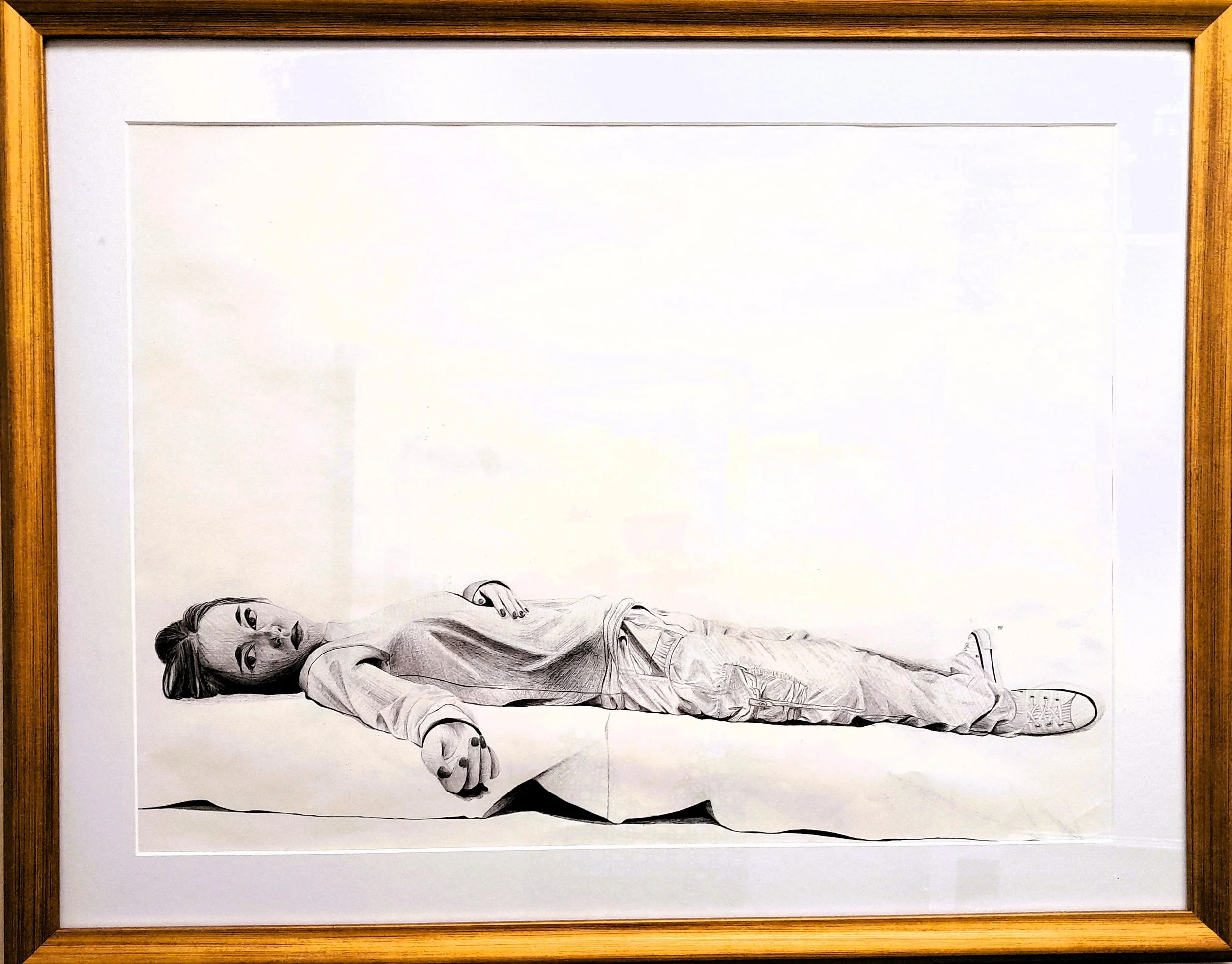 A black and white sketch of a young woman lying on a bed, looking at the viewer, with her left arm extended forward.